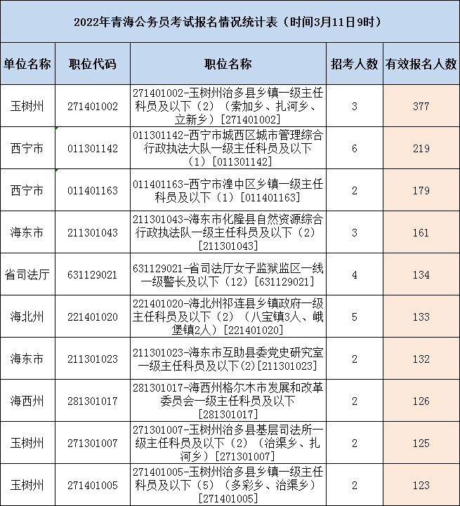 附件:青海省2022年公開考錄公務員考試報名情況統(tǒng)計表(截止時間3月11日9時)