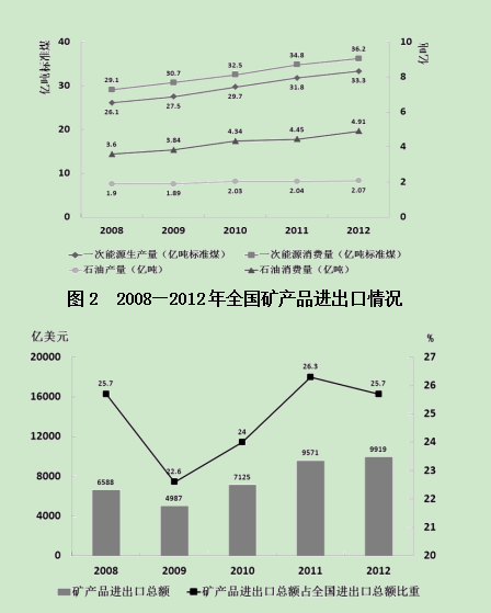 圖1 2008—2012年全國一次能源、石油生產(chǎn)量與消費量的情況