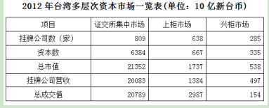 臺灣資本市場第三層次為興柜市場。在準(zhǔn)入門檻方面,興柜市場沒有營業(yè)利潤、資本額、設(shè)立年限的限制,只須符合已經(jīng)申報上市或上柜輔導(dǎo)且兩家以上證券商書面推薦。至2012年底,興柜公司285家,資本額0.335兆新臺幣,總市值0.538兆新臺幣。