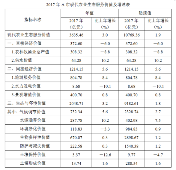 B、2017年A市現(xiàn)代農(nóng)業(yè)生態(tài)服務(wù)價值年值增長率、貼現(xiàn)值增長率最低的是同一個指標