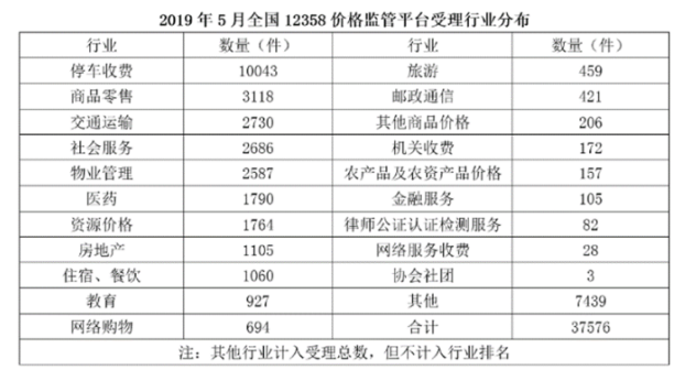 2019年5月,全國12358價格監(jiān)管平臺受理價格舉報、投訴、咨詢共計37576件,同比下降,環(huán)比下降。其中,價格舉報4192件,環(huán)比下降;價格投訴2059件,環(huán)比下降;價格咨詢31325件,環(huán)比下降。平臺受理量排名前十的省份依次是北京(5786件)、江蘇(3528件)、上海(2499件)、重慶(2486件)、河南(2469件)、陜西(2440件)、浙江(2321件)、天津(1571件)、福建(1483件)、廣西(1309件)。平臺受理量行業(yè)分布如下表所示: