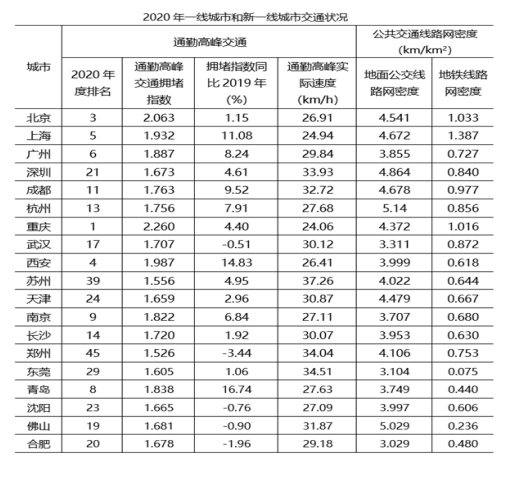 112.如果小張從家里到公司的距離是20公里,并且都采用開車方式,2020年他在下列哪個(gè)城市居住高峰時(shí)段通勤用時(shí)最短:( )