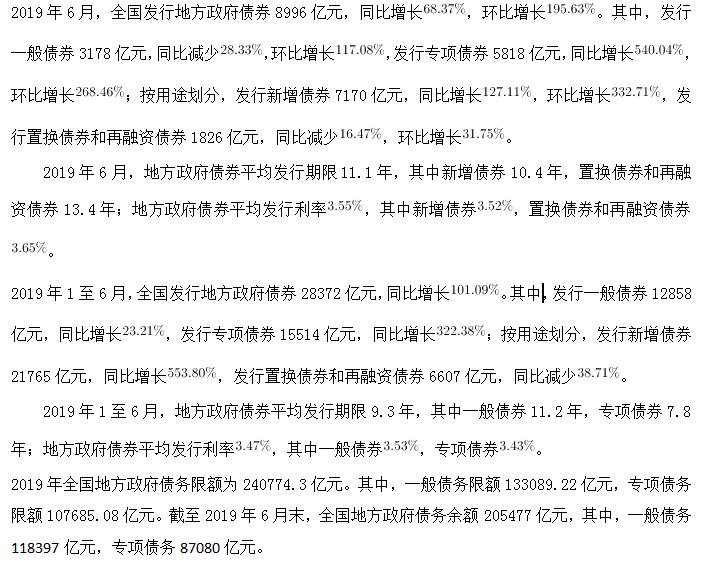 116、2019年6月,全國(guó)發(fā)行的地方政府債券比2018年6月多約:( )