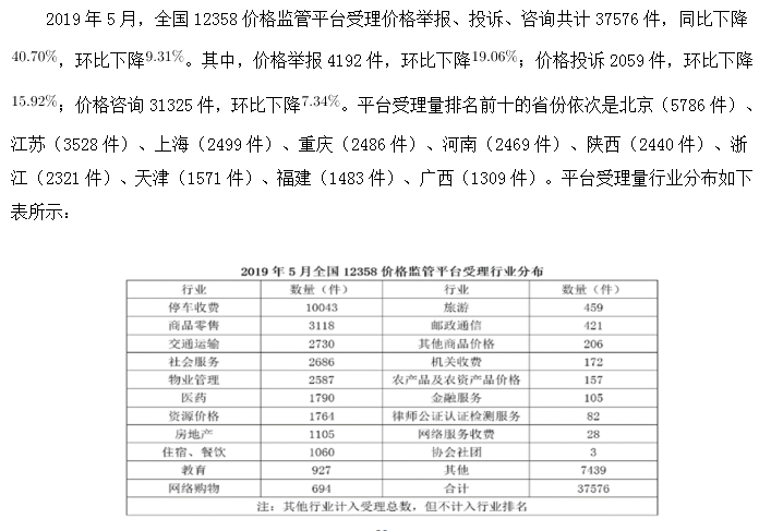 B、2019年5月,平臺(tái)受理價(jià)格咨詢數(shù)量環(huán)比下降幅度最大