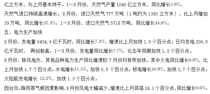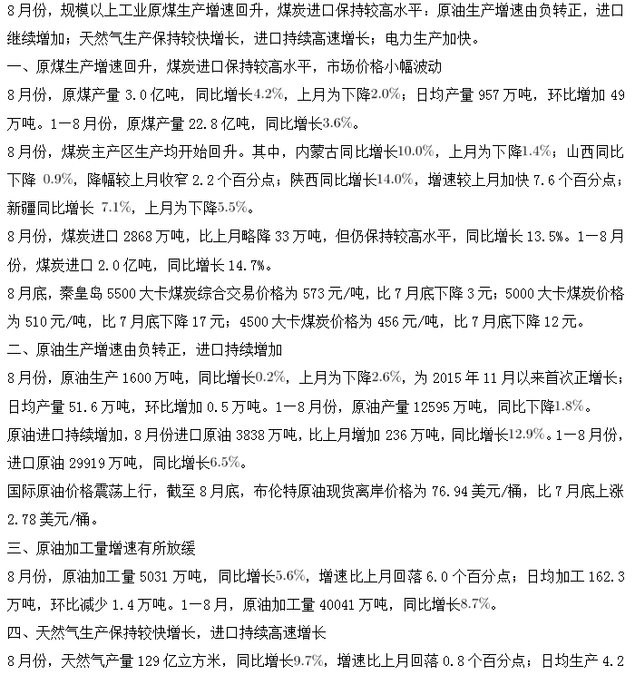 B.本年度8月份,原煤、天然氣、電力的生產同比均增長