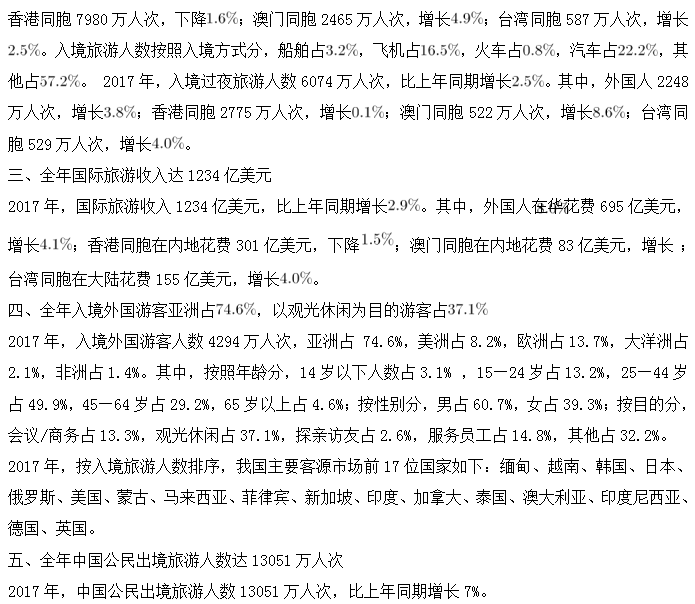 B.2017年,入境旅游人數按入境方式分:其他方式 >汽車 >飛機 >船舶 >火車