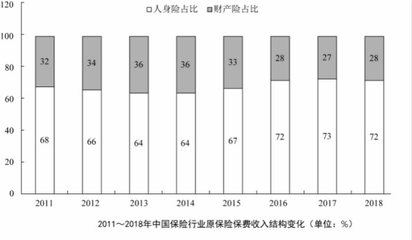 2018年,從險(xiǎn)種來看,財(cái)產(chǎn)險(xiǎn)業(yè)務(wù)原保險(xiǎn)保費(fèi)收入10770.08億元,同比增長9.51%;人身險(xiǎn)原保險(xiǎn)保費(fèi)收入27246.54億元,其中壽險(xiǎn)業(yè)務(wù)原保險(xiǎn)保費(fèi)收入20722.86億元,同比下降3.41%;健康險(xiǎn)業(yè)務(wù)原保險(xiǎn)保費(fèi)收入5448.13億元,同比增長24.12%;意外險(xiǎn)業(yè)務(wù)原保險(xiǎn)保費(fèi)收入1075.55億元,同比增長19.33%。從保費(fèi)收入結(jié)構(gòu)來看,人身險(xiǎn)、財(cái)產(chǎn)險(xiǎn)的保費(fèi)占比與上年相比趨于穩(wěn)定。