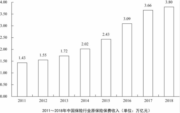D.2011~2018年,中國保險(xiǎn)行業(yè)原保險(xiǎn)保費(fèi)收入總計(jì)超過20萬億元
