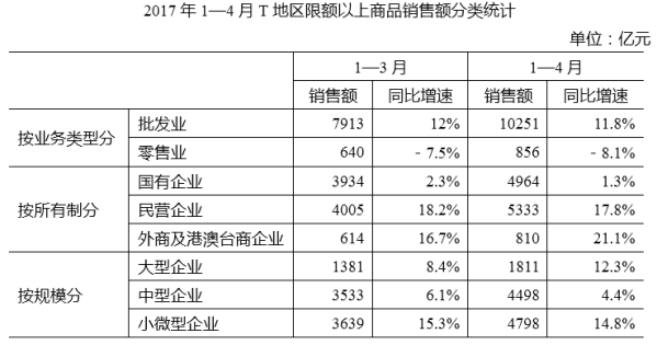 2017年1—4月,T地區(qū)批發(fā)和零售業(yè)商品銷售總額為15220億元,同比增長10.5%,其中,限額以上商品銷售額達(dá)到11107億元,同比增長10%;4月份,T地區(qū)批發(fā)和零售業(yè)商品銷售總額和限額以上商品銷售額分別為3339億元和2554億元。