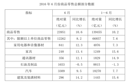 2016年1-6月份,我國(guó)社會(huì)消費(fèi)品零售總額156138億元,同比增長(zhǎng)10.3%。其中,限額以上單位消費(fèi)品零售額71075億元,同比增長(zhǎng)7.5%。