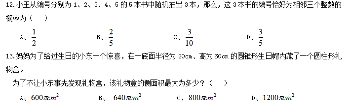 20.某商店促銷,購(gòu)物滿足一定金額可進(jìn)行摸球抽獎(jiǎng),中獎(jiǎng)率100%。規(guī)則如下:抽獎(jiǎng)箱中有大小相同的若干個(gè)紅球和白球,從中摸出兩個(gè)球,如果都是紅球,獲一等獎(jiǎng);如果都是白球,獲二等獎(jiǎng);如果是一紅一白,獲三等獎(jiǎng)。假定一、二、三等獎(jiǎng)的概率分別為0.1、0.3、0.6,那么抽獎(jiǎng)箱中球的個(gè)數(shù)為( )