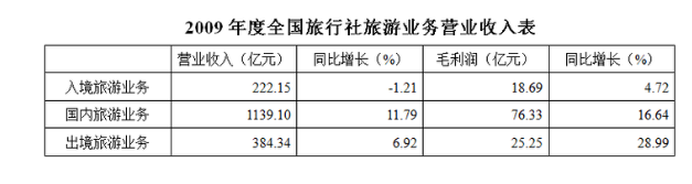 2009年度全國旅行社的旅游業(yè)務(wù)營業(yè)收入為1745.59億元,同比增長8.87%;旅游業(yè)務(wù)毛利潤為120.27億元,旅游業(yè)務(wù)毛利率為6.89%;實繳稅金為12.69億元,同比增長12.37%;外匯結(jié)匯10.51億美元,同比減少11.24%;全國促銷費支出為6.76億元,同比增長13.87%。
