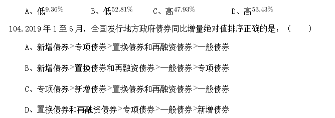 102.2019年6月,全國發(fā)行的地方政府債券比2018年6月多約:( )