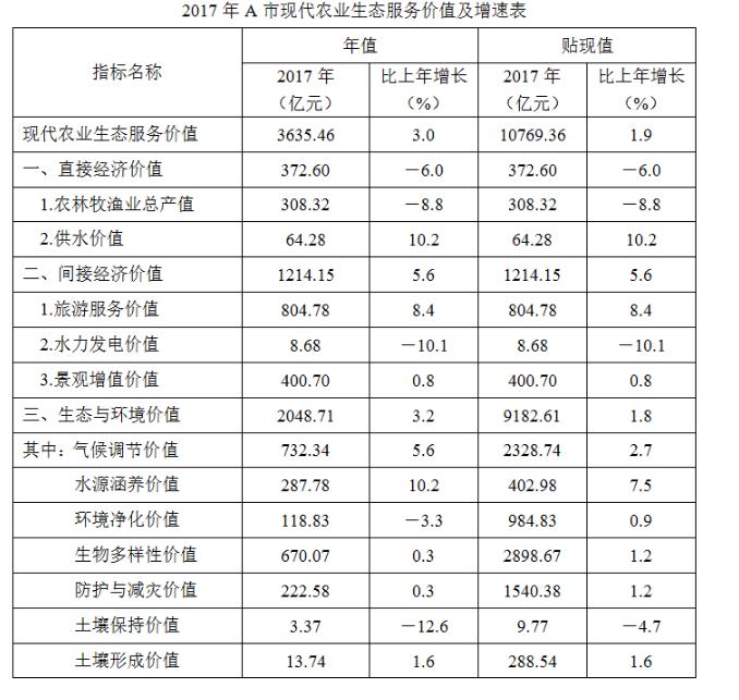 B、2017年A市現(xiàn)代農(nóng)業(yè)生態(tài)服務(wù)價值年值增長率、貼現(xiàn)值增長率最低的是同一個指標(biāo)