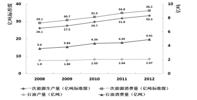 圖1 2008—2012年全國一次能源、石油生產(chǎn)量與消費(fèi)量的情況