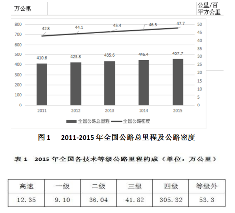 2015年年末全國公路總里程457.73萬公里,其中技術(shù)等級公路里程404.63萬公里,占公路總里程的比重比上一年提高1.0個百分點。