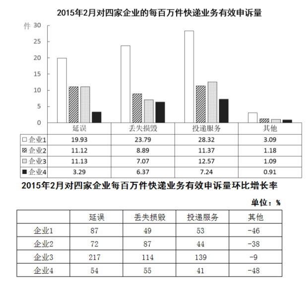 2015年2月,全國每百萬件快遞業(yè)務中,有效申訴量未23.4件,對企業(yè)1的每百萬件有效申訴量為75.13件,環(huán)比增長48.0%,對企業(yè)2的每百萬件有效申訴量未32.56件,環(huán)比增長55.0%,對企業(yè)3的每百萬件有效申訴量為31.86件,環(huán)比增長140.0%,對企業(yè)4的每百萬件有效申訴量為17.81件,環(huán)比增長36.0%。