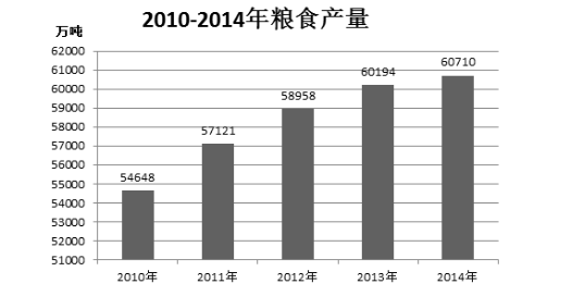 2014年糧食再獲豐收,今年糧食種植面積11274萬公頃,比上年增加78萬公頃,全年糧食產量為60710萬噸,其中夏糧產量13660萬噸,增產3.6%,早稻產量3401萬噸,減產0.4%,秋糧產量43649萬噸,增產0.1%,全年谷物產量55727萬噸,比上年增產0.8%,其中,稻谷產量20634萬噸,增產1.4%,小麥產量12617萬噸,增產3.5%,玉米產量21567萬噸,減產1.3%。