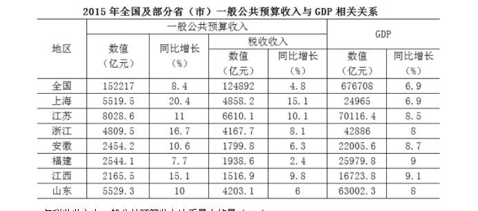D、2015年全國一般公共預算收入占GDP的比重較2014年有所減少