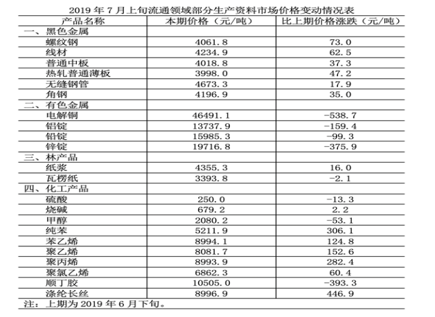 B.2019年7月上旬,黑色金屬中的線材價(jià)格環(huán)比漲幅最快