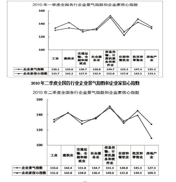 全國企業(yè)景氣調(diào)查結(jié)果顯示,2010年二季度,企業(yè)家信心指數(shù)為133.0,比上一季度回落2.5點;企業(yè)景氣指數(shù)為135.9,比一季度提高3.0點。2010年一季度全國各行業(yè)企業(yè)景氣指數(shù)和企業(yè)家信心指數(shù)
