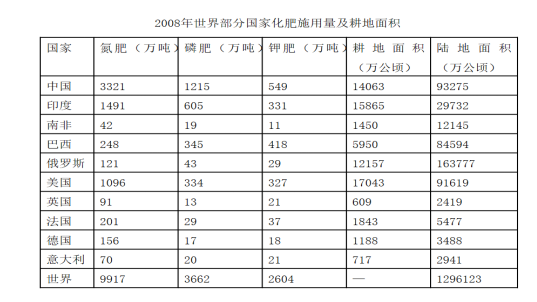 109.在上述國家中,2008年陸地面積超過5億公頃的國家中磷肥施用量低于100萬噸的有( )