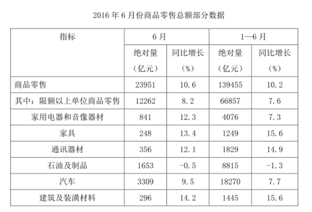 按經(jīng)營單位所在地分,2016年6月份,城鎮(zhèn)消費品零售額23082億元,同比增長10.5%;鄉(xiāng)村消費品零售額3775億元,同比增長11.2%。1-6月份,城鎮(zhèn)消費品零售額134249億元,同比增長10.2%;鄉(xiāng)村消費品零售額21889億元,同比增長11.0%。