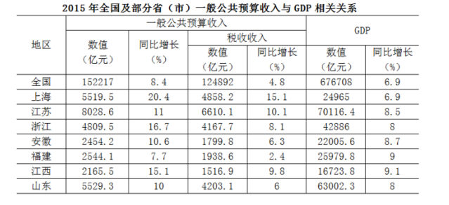 D、2015年全國一般公共預算收入占GDP的比重較2014年有所減少