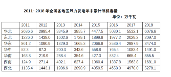 D.如保持2018年末同比增速,2020年華中地區(qū)風(fēng)力發(fā)電年末累計(jì)裝機(jī)容量將高于東北
