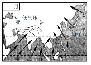 12.如圖所示,應(yīng)為亞洲東部哪個月的氣壓和風(fēng)向圖:( )