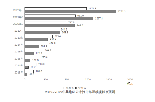 A.2022年該地區(qū)公有云和私有云市場規(guī)模差距將超過500億元