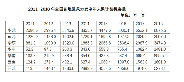 B.2017年華北地區(qū)風(fēng)力發(fā)電年末累計(jì)裝機(jī)容量同比增長了一成以上