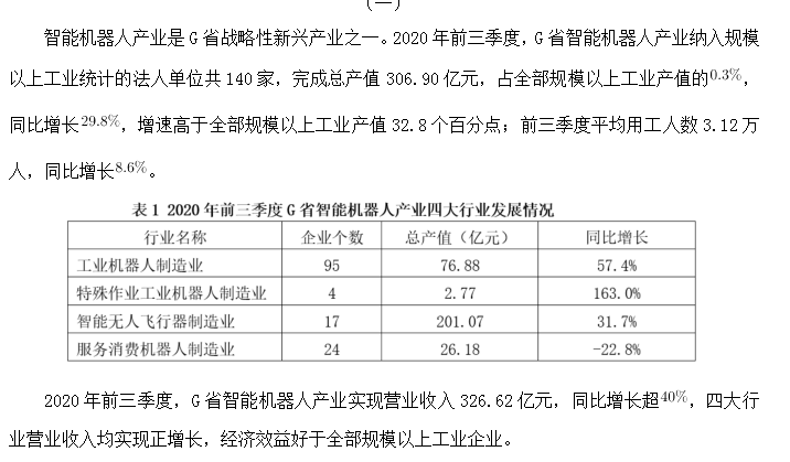 76.2020年前三季度,G省智能機器人產(chǎn)業(yè)中,四大行業(yè)總產(chǎn)值的同比增量排序正確的是( )