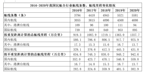 C.2016-2020年,按重復(fù)距離計算的總航線里程公里數(shù)年均增長不到100萬