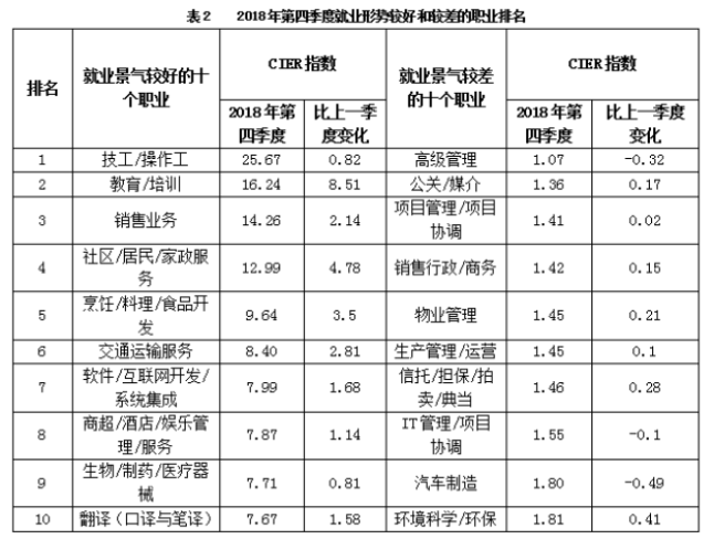 CIER指數(shù)用來(lái)反映就業(yè)市場(chǎng)景氣程度,其計(jì)算方法是:CIER指數(shù)=市場(chǎng)招聘需求人數(shù)/市場(chǎng)求職申請(qǐng)人數(shù)。根據(jù)有關(guān)機(jī)構(gòu)發(fā)布的數(shù)據(jù),2018年第一季度CIER指數(shù)為1.91,第二季度為1.88,第三季度為1.97,第四季度為2.38。2018年第三季度,招聘需求人數(shù)環(huán)比下降20.79%,求職申請(qǐng)人數(shù)環(huán)比下降24.37%;第四季度,招聘需求人數(shù)環(huán)比增加25.42%,求職申請(qǐng)人數(shù)環(huán)比增加3.9%。