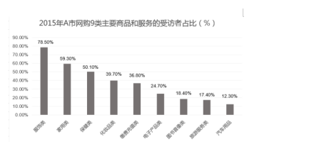 A市統(tǒng)計局在該市范圍內(nèi)做了一項調(diào)查,抽取了5000名18到70周歲且在2015年有過網(wǎng)購經(jīng)歷的居民,結果顯示:受訪者2015年人均網(wǎng)購次數(shù)為19.4次。從分組情況看,有三類人群使用網(wǎng)購相對頻繁:一是年輕群體,35歲以下的受訪者人均網(wǎng)購次數(shù)為25.5次;二是較高學歷群體,文化程度為大學本科及以上學歷和大專學歷的受訪者人均網(wǎng)購次數(shù)分別是27.3次和21.8次;三是中高收入群體,個人月收入為10000元以上和5000到10000元的受訪者人均網(wǎng)購次數(shù)分別是31.0次和26.0次。此外,女性受訪者人均網(wǎng)購次數(shù)為21.1次,比男性受訪者高出3.8次。2015年該市網(wǎng)購9類主要商品和服務的受訪者占比情況如下圖。