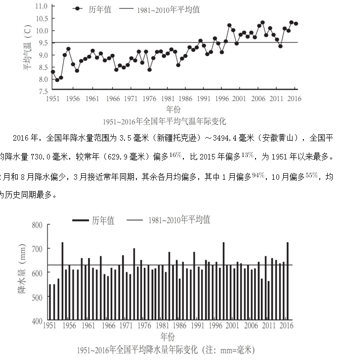 C、1951~2016年,降水偏多的年份氣溫就偏低