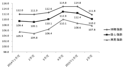 2014年1季度-2015年2季度Z省消費(fèi)者信心指數(shù)、滿意指數(shù)、預(yù)期指數(shù)