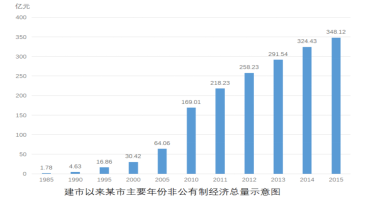 2015年,某市非公有制經(jīng)濟(jì)實現(xiàn)增加值348.12億元,比上年凈增加23.69億元,非公有制經(jīng)濟(jì)增加值占GDP的比重為57.5%。其中,民營經(jīng)濟(jì)增加值335.24億元,外商經(jīng)濟(jì)增加值11.84億元,港澳臺經(jīng)濟(jì)增加值1.04億元,分別比“十一五”(2010年)末增長104.3%、162.9%和147.4%。