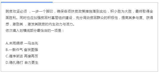 C項(xiàng)“循序漸進(jìn)”是按一定的順序、步驟逐漸進(jìn)步,符合文意。D項(xiàng)“穩(wěn)扎穩(wěn)打”比喻有把握、有步驟地工作,符合文意。然后 分析第二空。根據(jù)“激發(fā)其脫貧的內(nèi)生動(dòng)力與活力”可知,這里強(qiáng)調(diào)的是主要依靠自身的力量。