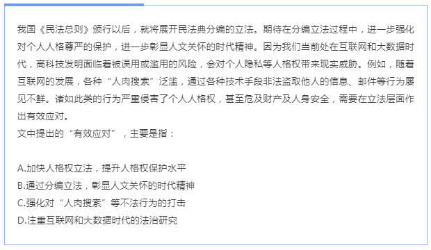 【解析】本題是語(yǔ)句理解題,側(cè)重考察對(duì)語(yǔ)句的理解是否全面和正確。首先找到 “有效應(yīng)對(duì)”,它在文段最后一句“需要在立法層面做出有效應(yīng)對(duì)”。根據(jù)就近原則向前找,“諸如此類(lèi)的……需要……”,說(shuō)明“有效應(yīng)對(duì)”解決的是“此類(lèi)行為”,而“此類(lèi)”需繼續(xù)向前找,前一句是例如,表舉例,繼續(xù)向前找,“會(huì)對(duì)個(gè)人隱私權(quán)等人格權(quán)帶來(lái)顯示威脅”,故應(yīng)對(duì)的是人格權(quán)帶來(lái)的威脅。所以 對(duì)比選項(xiàng),A項(xiàng)提到“人格權(quán)”和“立法”。因此,選擇A選項(xiàng)。