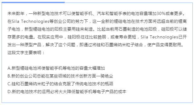 【解析】這是一道主旨概括題。在 文段首句提出一種新型電池技術(shù)可以增加智能手機(jī)、汽車(chē)和智能手表的電池容量。后文明確該新型技術(shù),并且通過(guò)兩方面分析了該技術(shù)能增加電池容量的原因,一是硅陽(yáng)極可以存儲(chǔ)更多電量,二是硅和石墨烯納米粒子的結(jié)合可以解決硅陽(yáng)極比較脆弱的問(wèn)題。所以文段是“總—分”結(jié)構(gòu),確定文段的前兩句為主旨句,全文論述的核心話題為“全新的鋰硅電池”。之后 對(duì)比選項(xiàng)。A項(xiàng)是對(duì)文段重點(diǎn)的同義替換。因此,選擇A選項(xiàng)。
