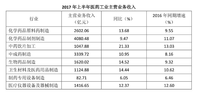 2017年上半年醫(yī)藥工業(yè)規(guī)模以上企業(yè)實現(xiàn)主營業(yè)務收入15314.40億元,同比增長12.39%,增速較上年同期提高2.25個百分點。各子行業(yè)中,增長最快的是中藥飲片加工,化學藥品制劑、中成藥、制藥設(shè)備的增速低于行業(yè)平均水平。