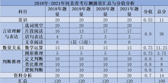 從上表我們分析出,近幾年省考行測(cè)科目題型一直比較穩(wěn)定。行測(cè)總題量依然保持130題不變,各部分的題量分布近幾年一直沒(méi)變,言語(yǔ)理解和判斷推理題目題量占的比重最大;數(shù)量關(guān)系、資料分析和常識(shí)判斷題量相似,一般有15~20個(gè)小題。
