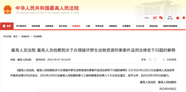 最高人民法院、最高人民檢察院聯(lián)合發(fā)布《關(guān)于辦理破壞野生動(dòng)物資源刑事案件適用法律若干問題的解釋》,自2022年4月9日起施行。