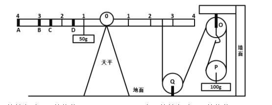 85.如圖所示,地面上有一架天平,天平左端系有一個50g的物體,右端通過繩子連接一組滑輪。滑輪組合中,O、Q為定滑輪,P為動滑輪,下端系有一個100g的物體。要使天平兩端平衡,需要的操作是( )。
