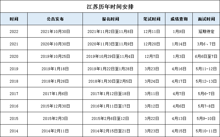 根據(jù)上表,我們可以發(fā)現(xiàn):2014~2019年江蘇公務(wù)員考試時間還算穩(wěn)定,而2020~2022年江蘇省考與往年相比,報名考試時間提前約3個月!