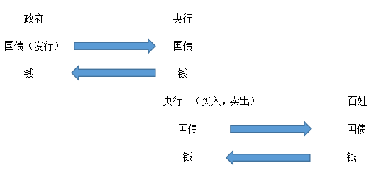 通過這張圖示大家可以看出來,當(dāng)政府和央行之間流通國債是屬于財政政策的,當(dāng)政府發(fā)行國債后,并不是直接和百姓進行交易,是賣給央行,政府拿到錢之后會用于彌補財政赤字,基礎(chǔ)設(shè)施建設(shè),所以這個時候市場當(dāng)中的貨幣供應(yīng)量會增加。當(dāng)央行賣出國債的時候會把國債賣個百姓,百姓把錢給央行,會導(dǎo)致市場中的貨幣供應(yīng)量減少。