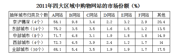 119.2011年上述表格所列的購物網(wǎng)站中,有2個以上區(qū)域市場化比其抽樣市場平均份額高1個百分點的是:( )