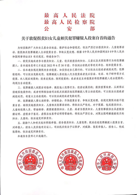 最高法最高檢公安部聯(lián)合發(fā)布通告敦促拐賣婦女兒童相關(guān)犯罪嫌疑人投案自首